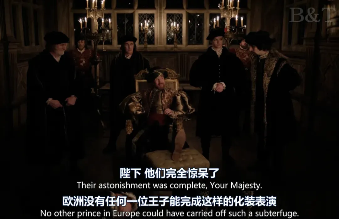 当亨利八世完成了一场化装舞会表演之后,马上在旁边吹彩虹屁。